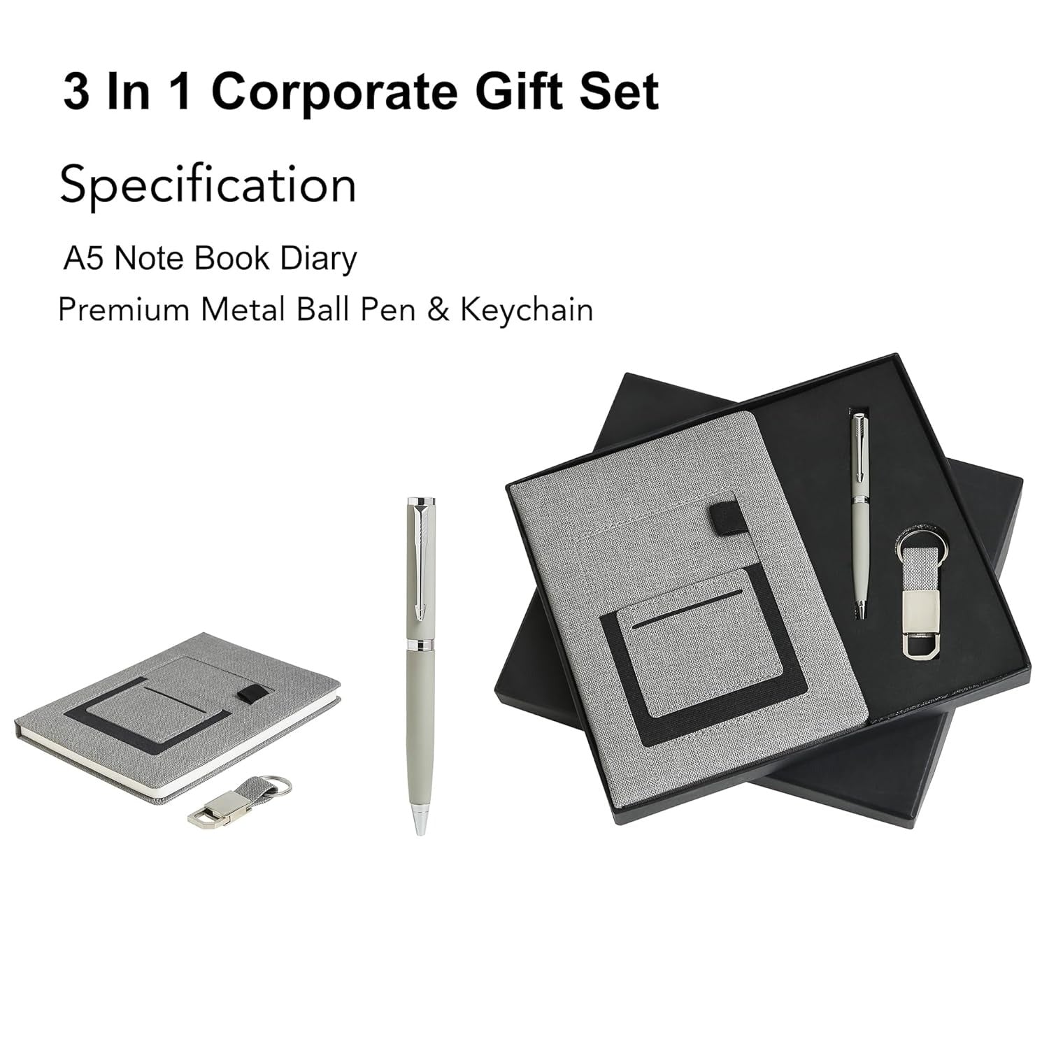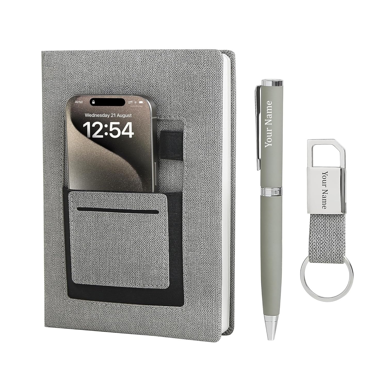 Tempt Personalized Diary with Pen and Metal Keychain Gift Set with Name, 3 in 1 Personalized Organiser Diary Combo Gift for Husband, Father, Corporate Customized New Year Gift for Employees - Grey
